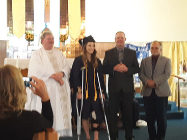 Following Kim, Salutatorian Jessie Sonnen gave her address, in which she explained that an education at St. John Bosco Academy is sometimes 'uncomfortable'. She gave some examples of hard work required to grow as a person and as a student. While some of these experiences may be uncomfortable at the time, she explained how they have prepared the graduates for their future. Valedictorian David Wassmuth compared the four graduates to points on a compass rose. Jessie was represented as North, as she is always headed in the right direction and can help any of the others get onto the right path. Erin and Lexi were East and West with their sunny personalities who brought fun to everything. David left South for himself, as the levelheaded one, who keeps everyone else upright and moving. David compared the compass to formation at SJB. The graduates now have a properly working compass to guide them throughout their lives.