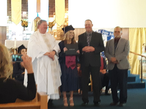 Principal Jim Hickel and Board President Eric Wassmuth presented each graduate with their diploma. Awards were presented by Principal Hickel and Amy Gorges. Three special awards are presented at each graduation, which are previously voted on by faculty and staff. The St. John Bosco Award was presented to Jessie Sonnen as one who is always pleasant in good times and bad, reaches out to others, and has the best overall attitude. The Patriot Award was presented to David Wassmuth as one who can always be relied on to work hard in all academic areas, volunteers in many ways and has a strong work ethic. The most prestigious award, the Excelsior Award, was presented to Alexis Currier. She is the most balanced intellectually, spiritually, apostolically and humanly. She sums up the "Excelsior" (Ever Higher) spirit of St. John Bosco Academy in all that she does.